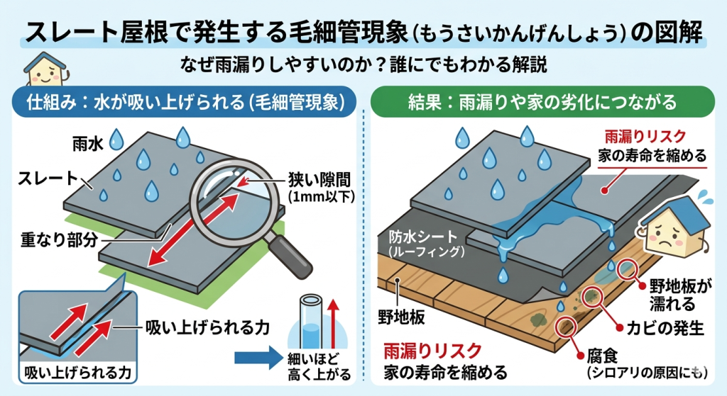 屋根材の重なり部分が塗料で塞がれると、わずかな隙間が毛細管のような状態になります。 そこに雨水が触れると、水は下に流れるどころか、隙間の中へ吸い上げられていきます。 吸い上げられた水は行き場を失い、屋根の下地へと浸入していく。 これが雨漏りの正体です。