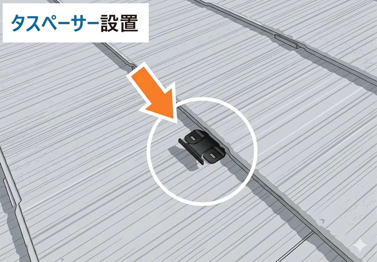 【落とし穴】 タスペーサーは屋根材1枚に対して2箇所差し込むのが基本です。 しかし手を抜く業者は1箇所だけ、あるいは飛ばして差し込まない箇所を作ることがあります。 差し込み本数が少ないと、隙間が確保できていない部分から水が入るリスクが残ります。